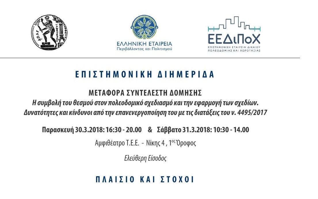 Επιστημονική Διημερίδα: Μεταφορά συντελεστή δόμησης. Η συμβολή του θεσμού στον πολεμικό σχεδιασμό και την εφαρμογή των σχεδίων. Δυνατότητες και κίνδυνοι από την επαναενεργοποίηση του με τις διατάξεις του ν. 4495/2017. Παρασκευή 30-31.3.2018